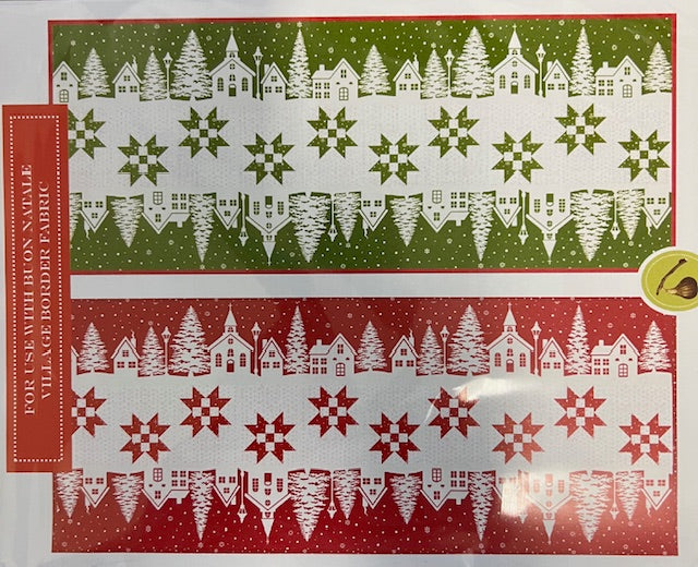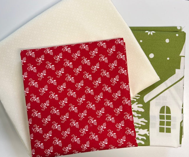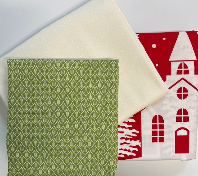 Shown in Buon Natale fabrics by Fig Tree and Co. You have the choice of the red or green background in your kit. Each kit has the pattern, background and a binding. The red kit comes with green binding and the green kit comes with red binding. You will need to provide a backing fabric.