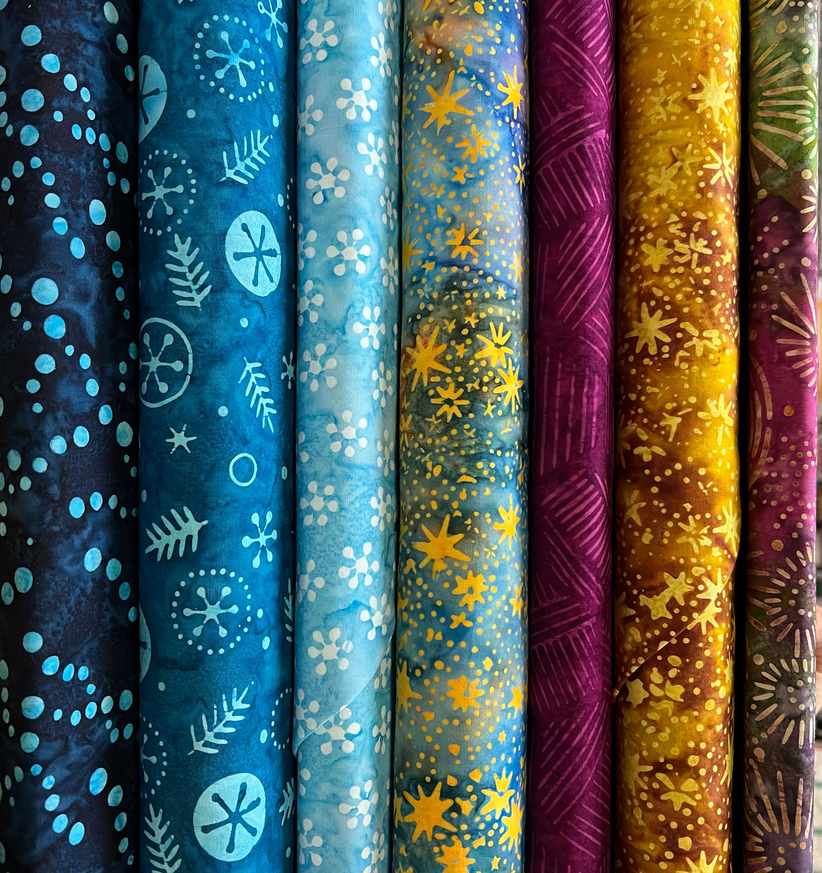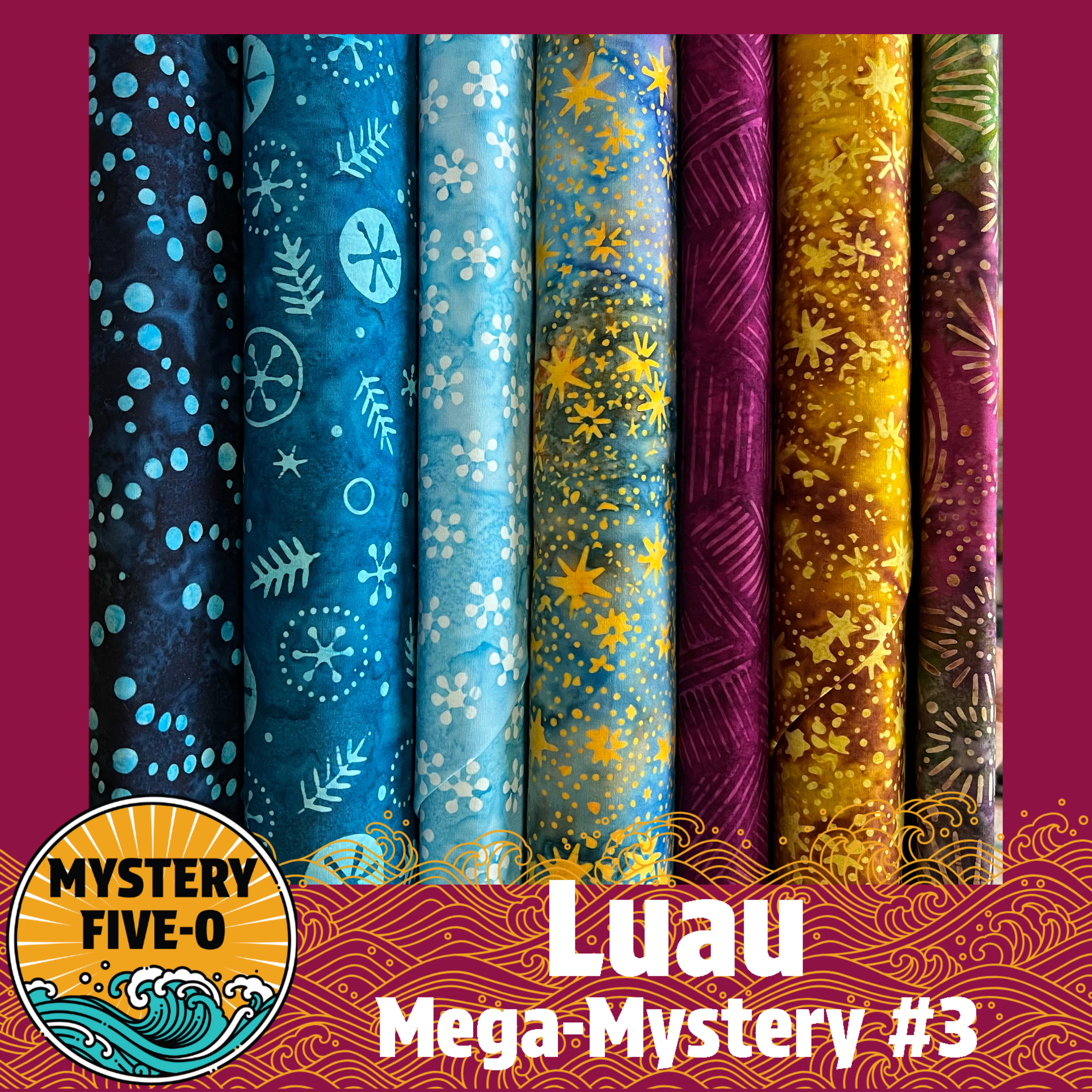 Our Luau Kit #6 has all the fabrics you need for either setting of the Luau Mystery - Luau Torches (65"×83") or Luau Feast (75"×75"). Binding is also included in the kit. Backing is not included. Berry Batik