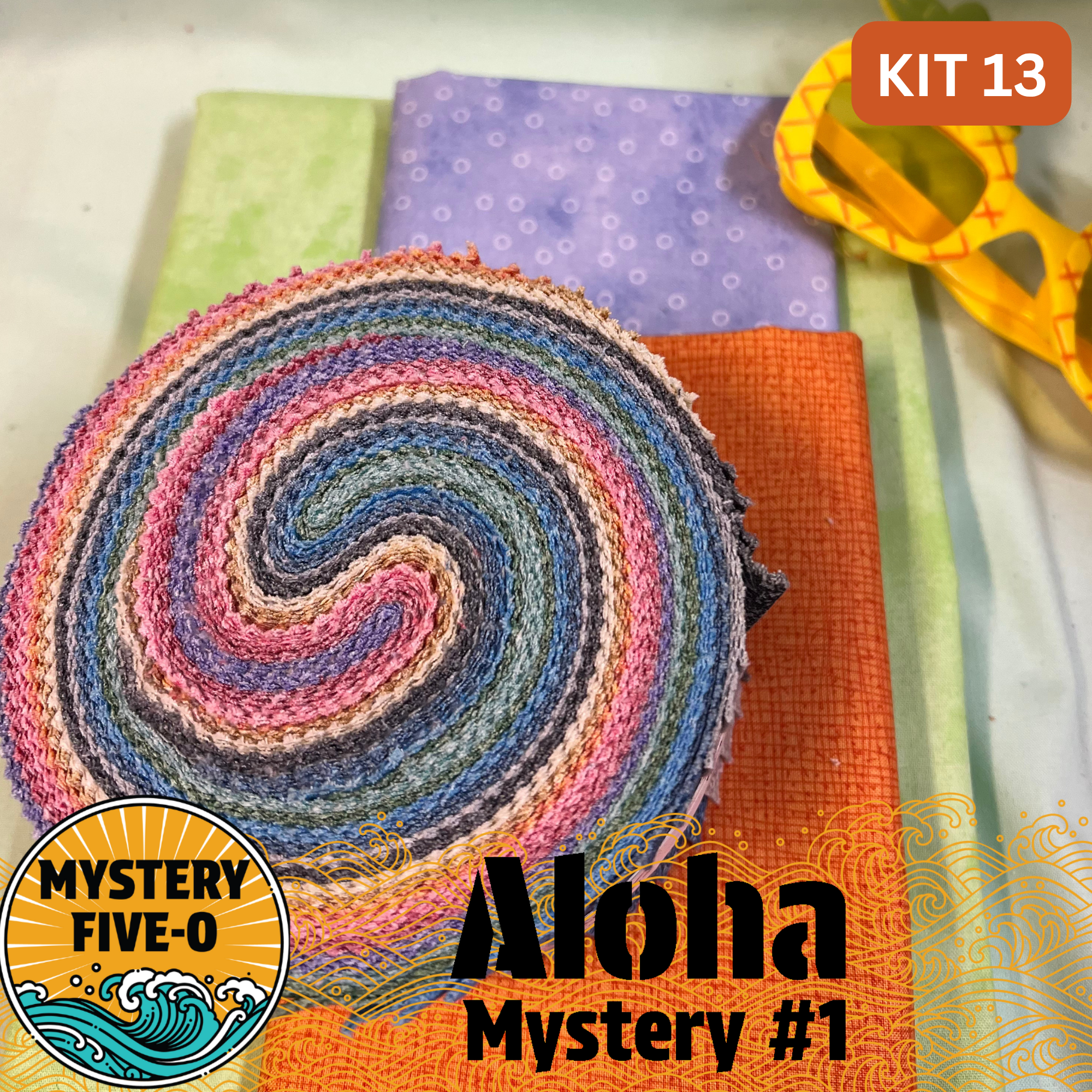 Our Aloha Mystery Quilt Kit #13 has a jelly roll and fabrics to make the 56" x 72" Aloha Mystery Quilt. Binding has two options - scrappy with leftover jelly roll strips or the fabric piece included in your kit. You will get the Clues weekly via email, one at a time, starting on Aug. 6, 2025.