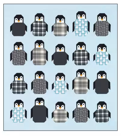 Penguin quilt pattern featuring 60in x 66in lap quilt, 50in x 50in child quilt, and 20in x 20in pillow projects. All projects are made with conventional patchwork techniques using fat quarters or precut 10in squares. No templates or paper piecing.