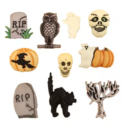 These buttons are delightfully spooktastic and are sure to add a little fright to your next project! Each pack includes 10 buttons that have shank and a flat back.