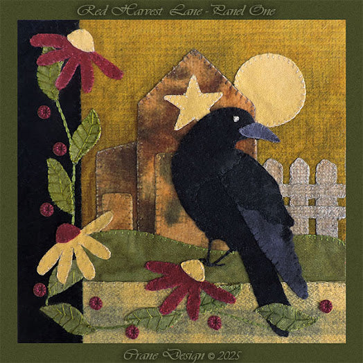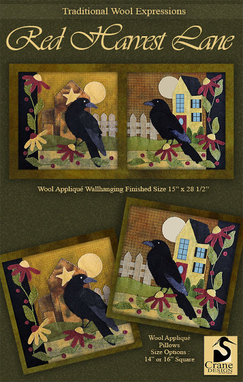Red Harvest Lane pattern by Jan Mott of Crane Designs. Wallhanging Finished Size: 15 inch x 18 1/2 inch, Pillow Finished Size: 14 inch or 16 inch