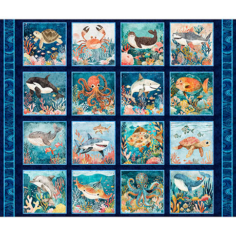 Deep Sea Dazzle by the Morris Creative Group for QT Fabrics. Undersea Picture Patches Panel Navy (Panel measures approx. 36 inches x WOF)