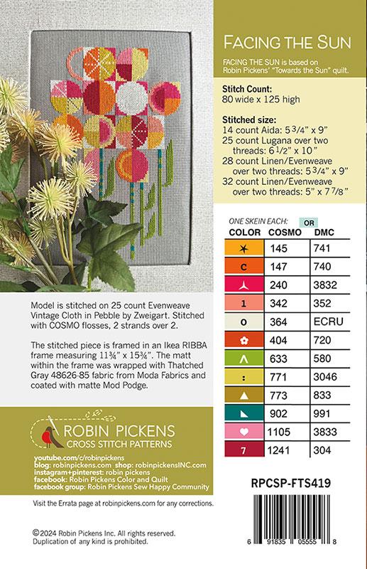 Facing the Sun is a cross stitch pattern designed by Robin Pickens to mimic her Towards the Sun quilt. Modern blooms stretch up to the sky in a contemporary garden. Model is stitched on 25 count Vintage cloth in Pebble with Cosmo flosses.