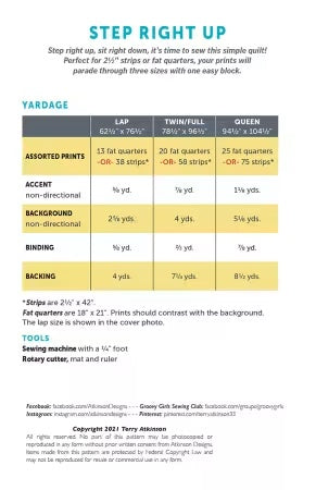 Step right up, sit right down, it's time to sew this simple quilt! Perfect for 2.5" strips or fat quarters your prints will parade through three sizes with one easy block. Three sizes included: lap, twin/full, queen.