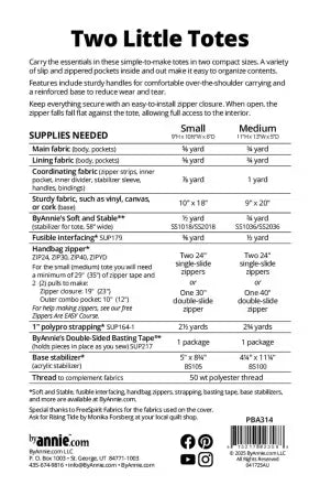Carry the essentials with Two Little Totes!This versatile pattern includes instructions for creating simple-to-make totes in two compact sizes. They're the perfect size for daily use, shopping, carrying a craft project, and more.