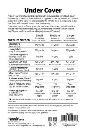 Protect your cherished sewing machine with its own quilt!Each cover features slip pockets on front and back, a zippered pocket on the left side, and a mesh slip pocket on the right side.For easy access to the sewing machine handle, there is an opening at the top. Flaps with magnetic snaps cover the opening.The pattern includes complete step-by-step instructions for covers in three sizes to fit many popular machines.